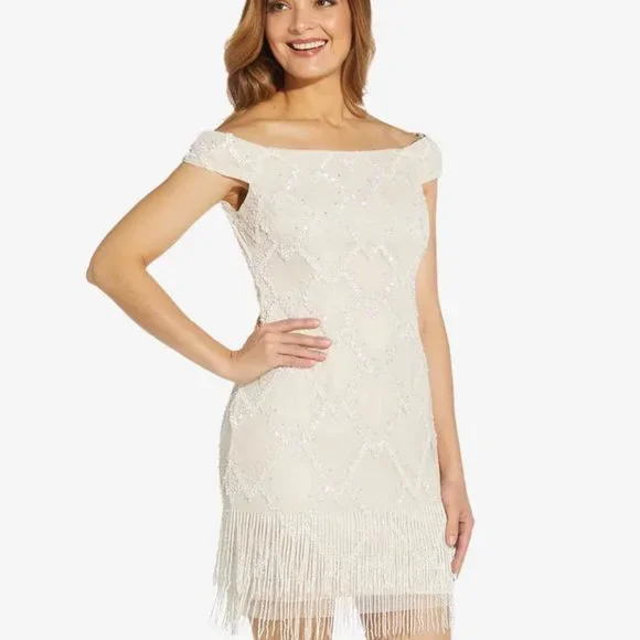 Adrianna Papell Dresses Adrianna Papell New Size 6 Ivory White Fringe Beaded Mesh Off Shoulder Dress Poshmark